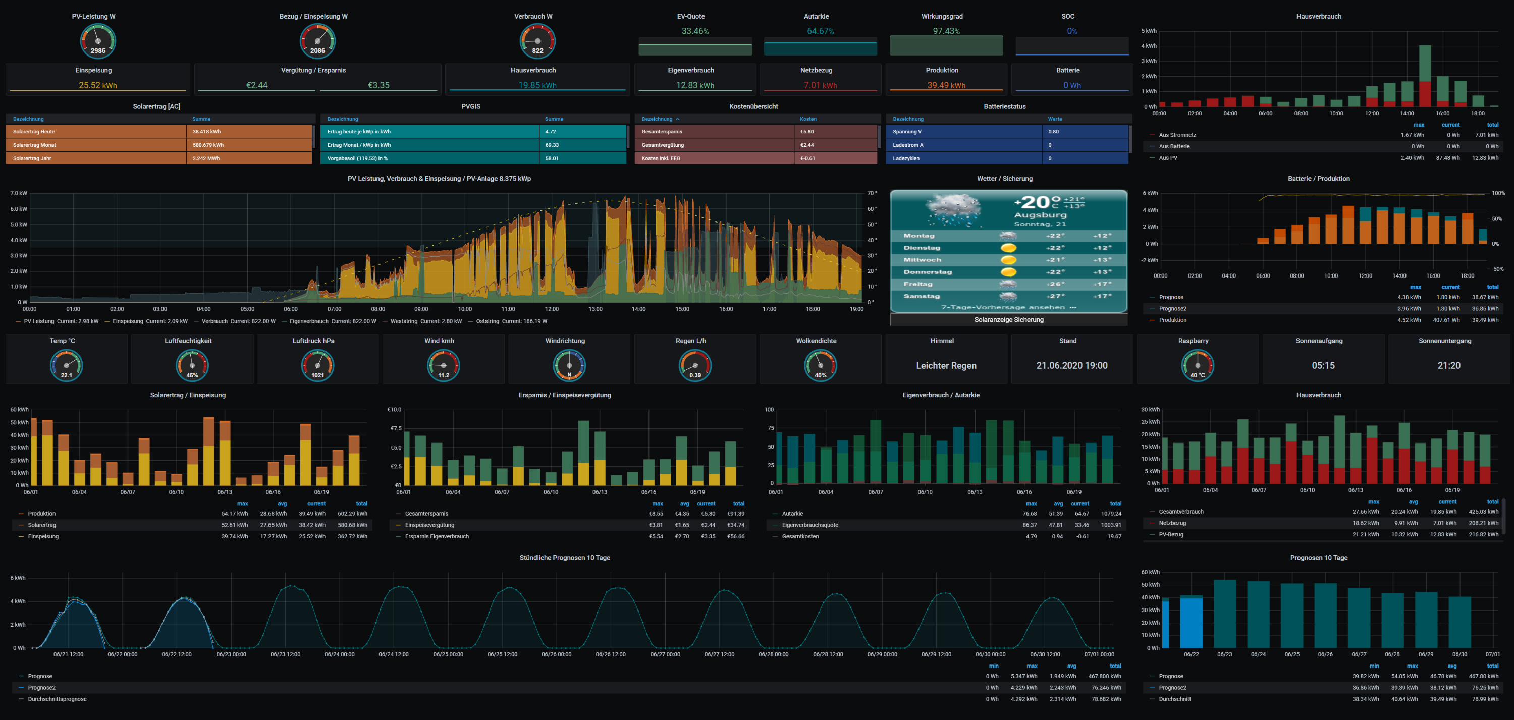 Ich nutze den Durchschnitt aus Prognose und PrognoseL (um eine Stunde versetzt und um die stündlichen Faktoren korrigiert in der prognose.php), dieser wird noch einmal mit einem Faktor im Dashboard (als Dashboard-Variable definiert) korrigiert, dieser ist aktuell bei mir 0.97.