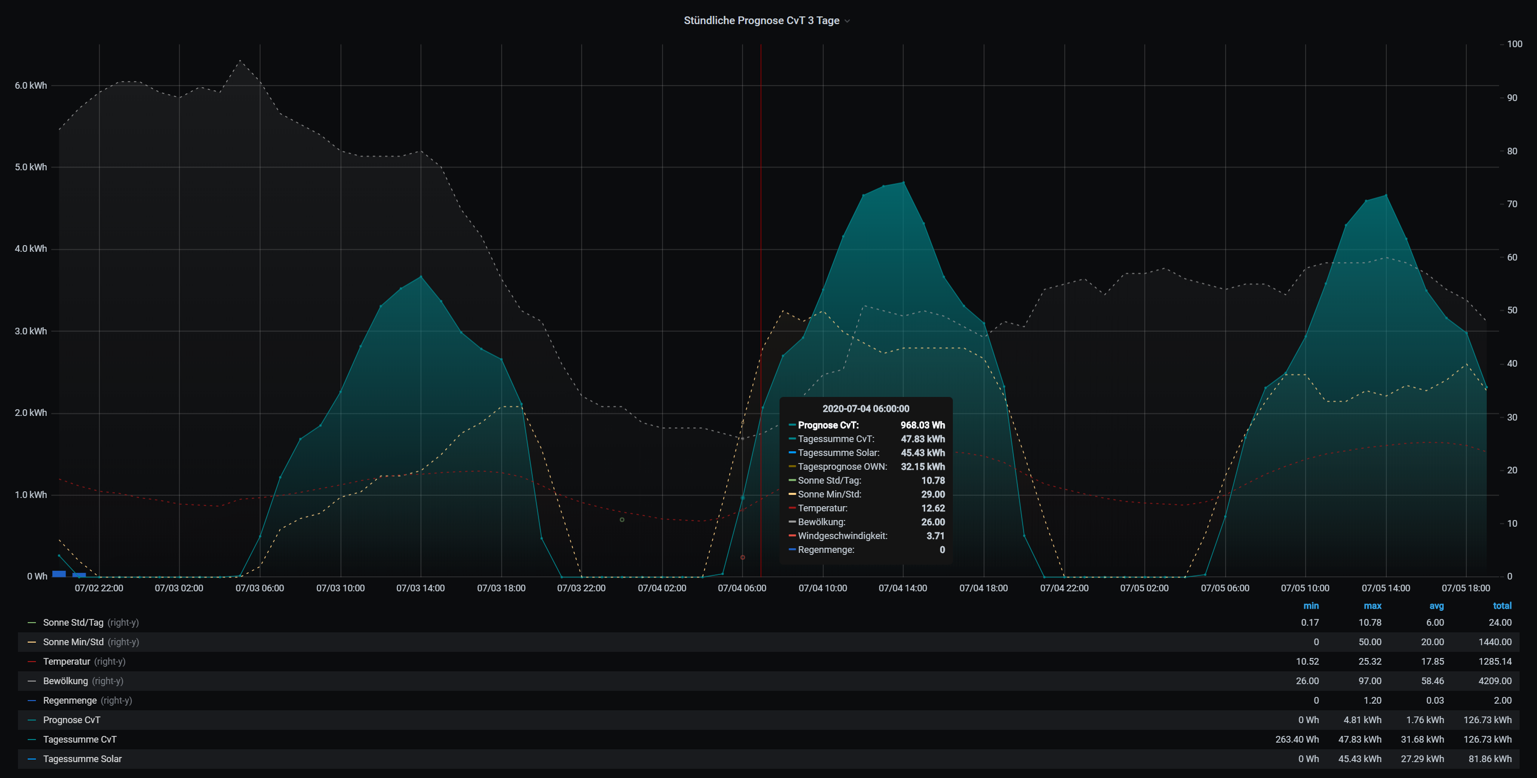 - In der Praxis hat es sich bei mir bewährt, einen Durchschnitt aus (eigenePrognose + eigenePrognoseL) / 2 zu bilden, mit passendem Korrekturfaktor habe ich an sonnigen Tagen kaum noch eine Abweichung.