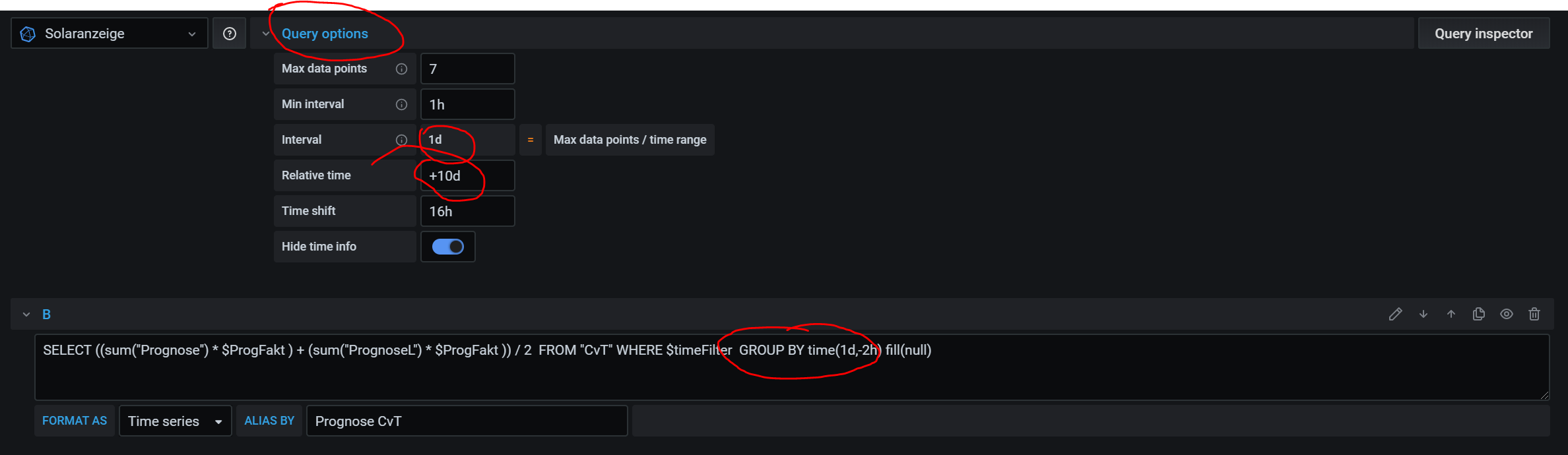 Jetzt muss ich nur schauen, wie ich mir in Grafana die Daten zur Anzeige bringen kann. Würde mir sehr helfen, wenn du mir den "select" für die "Stündlichen Prognosen 10 Tage" zeigst. Dadrauf könnte ich dann aufsetzen.