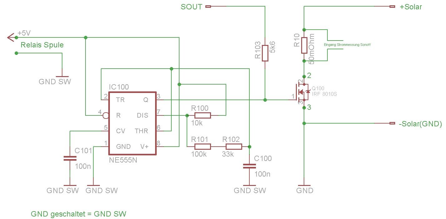 Den Strom der Zelle schalten wir mit einem Mosfet (hier IRF 8010 aber jeder Mosfet mit unter 20-30 mOhm sollte das können) ca. 50 mal in der Sekunde ein und aus. Zusätzlich legen wir die Ansteuerung des Mosfets auf den Spannungs-Messeingang des Sonoffs. Dazu beschalten wir einen NE555 Timer als astabile Kippstufe, der den Mosfet und den Spannungseingang des Sonoff mit den 50 Hz versorgt.