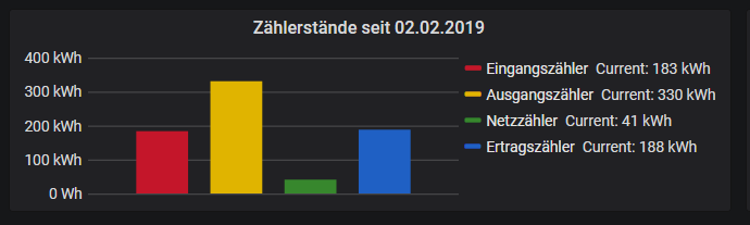 Ich habe mir 3 Zähler mit S0 Schnittstelle in meine Unterverteilung eingebaut und erfasse damit den Eingang und Ausgang meines PIP und eben den Ausgang meines EVT und übertrage die Daten nach InfluxDB und bereite mir die Daten in Grafana auf.