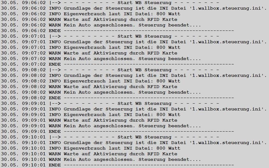 Die Log Datei sagt aber, "Kein Auto angeschlossen" und "Warte auf Aktivierung durch RFID Karte"