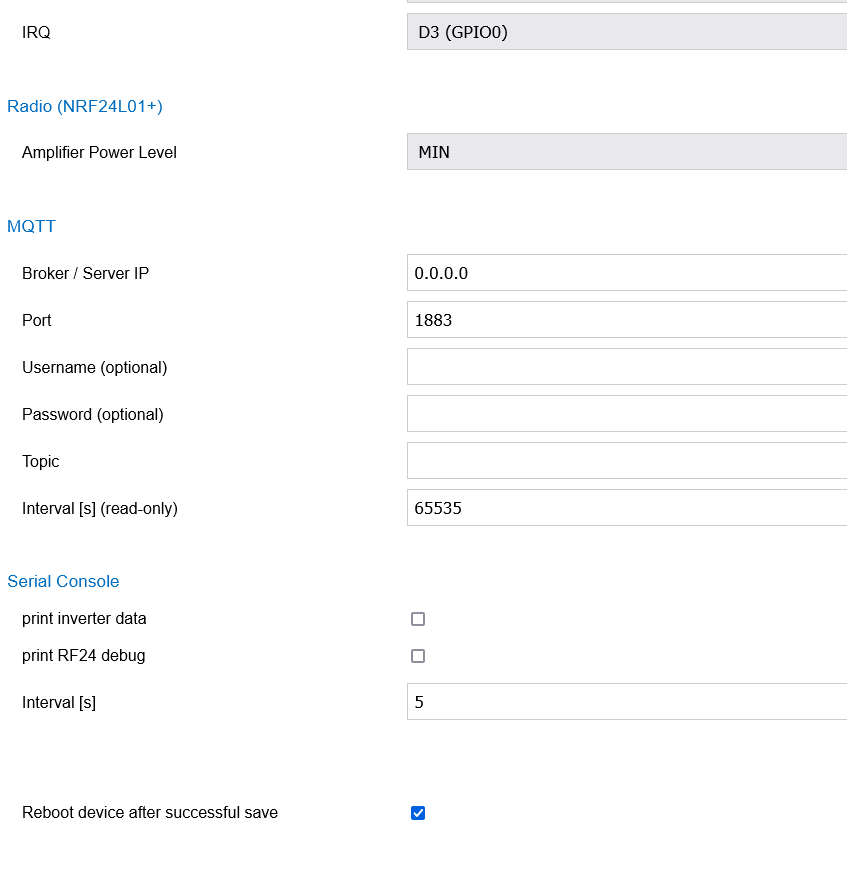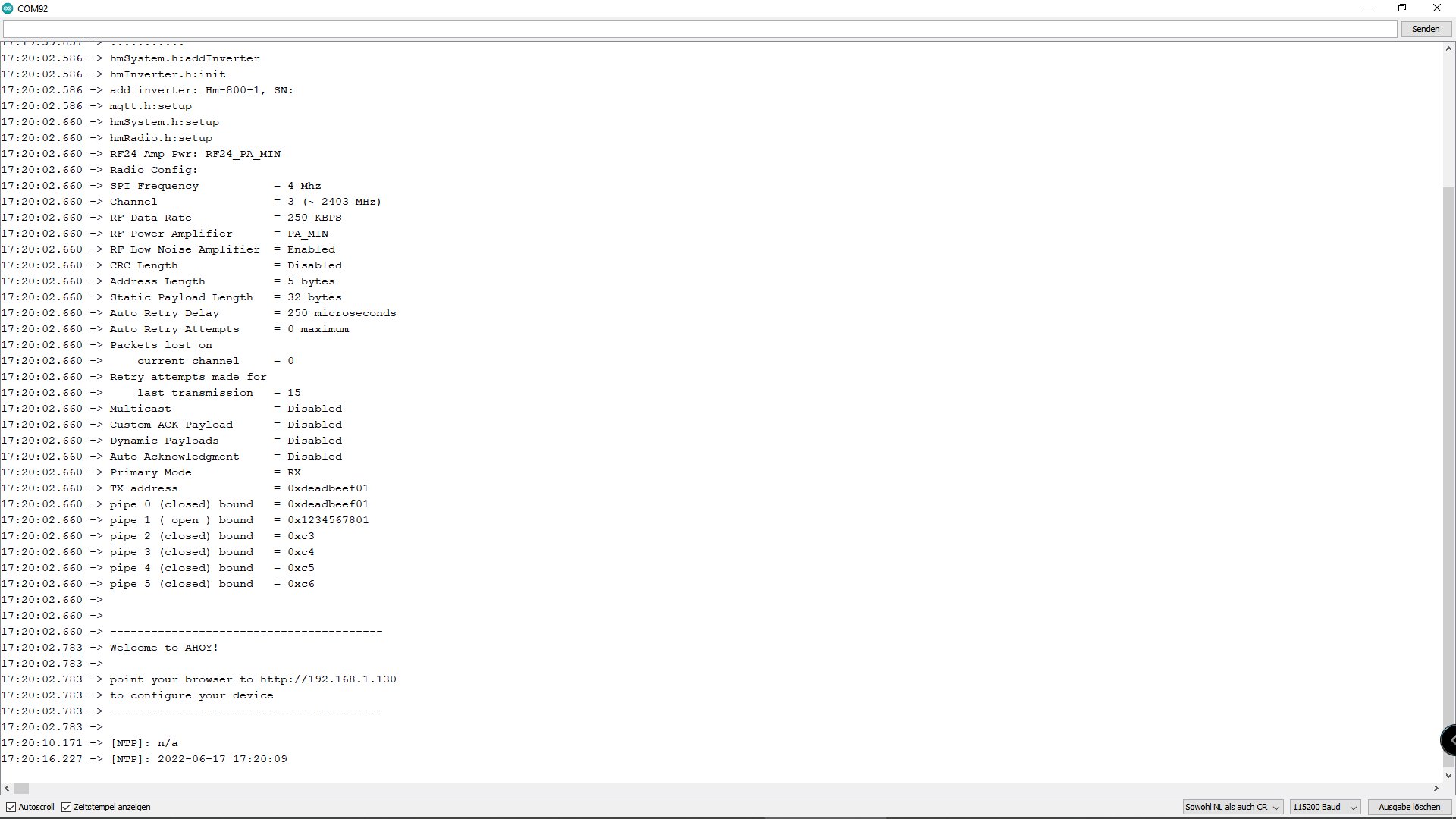 Es gibt noch eine Universalvariante die wohl den Arduino als auch ESP8266 unterstützt, von der bin ich aber weniger begeistert weil als erste Fehlermeldung gleich sowas kommt wie "D3 nicht definiert"....also ein Eingangspin vom ESP, da hatte ich es gleich satt und habe mir die Version von Ahoy geladen die nur für den ESP8266 geschrieben ist. Den NRF24l01+ habe ich mir bei Ali besorgt und nachdem alle richtigen Bibliotheken installiert waren und alle Verbinddungsdrähte auch endlich am richtigen Pin gelandet sind funktioniert es jetzt auch. (SPI Schnittstelle 2)