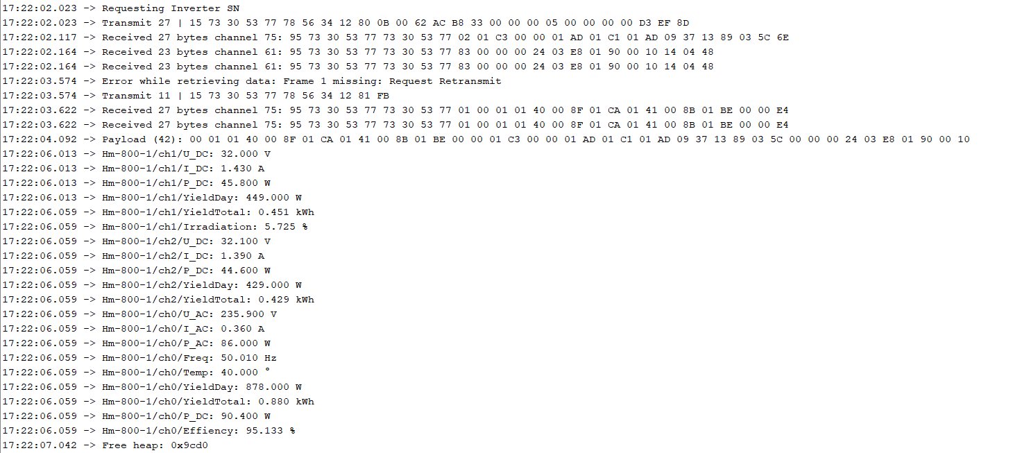 Es geht im Prinzip darum den Wechselrichter ohne diesen ganzen überteuerten Hoymiles Kram auszulesen und zwar direkt über das eingebaute Funkmodul. Ich selber habe den HM800 wobei es inzwischen wohl eine neue Serie gibt. Ich habe derzeit keine Zeit dafür und verwende vorerst zwei INV 350-60 RS485 Wechselrichter weiter bis ich Zeit finde mir das anzuschauen. Wie es aussieht sind die da in dem Forum schon ziemlich weit und haben das Protokoll zum großteil geknackt. Da ich kein Programierer bin, bin ich auf nahezu fertig programmierte Software für den ESP8266 angewiesen, sollte das Projekt einsatzfähig sein werd ich es mal ausprobieren. grüße Solar1228