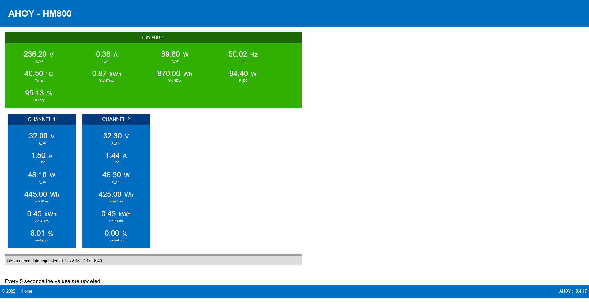 Im Moment zeigt er nur einen der 4 Kanäle, die 882 Wh und die 99 kWh stimmen auch exakt mit der AHOY-Anzeige überein.