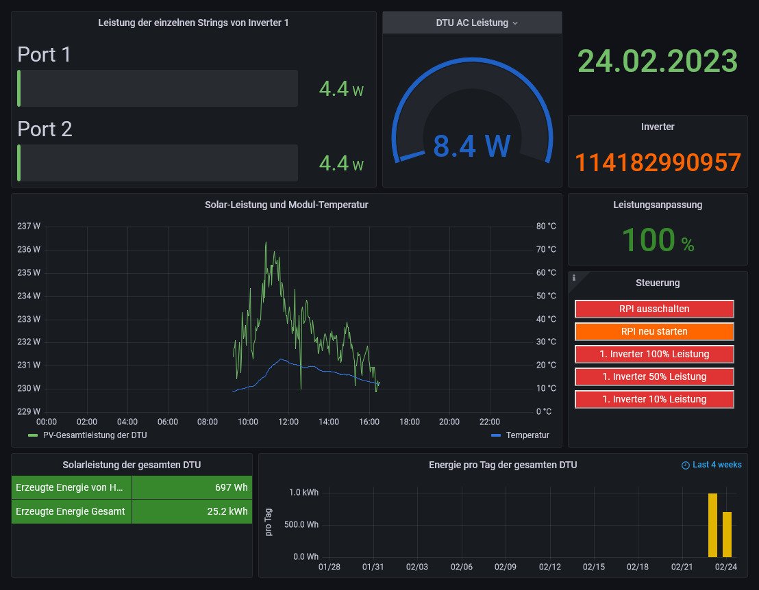 Die OpenDTU ist nach einem update implementiert. Auf dem Dashboard gibt es 3 Buttons. Man kann 100%, 50% und 10% Leistung einstellen. Über eine API können weitere Werte benutzt werden. Genauere Informationen gibt es hier: viewtopic.php?t=3415&sid=1fbf9ceaad9b23 ... 2fc91d1e1e Das Dashboard zum importieren ist hier: viewtopic.php?t=188