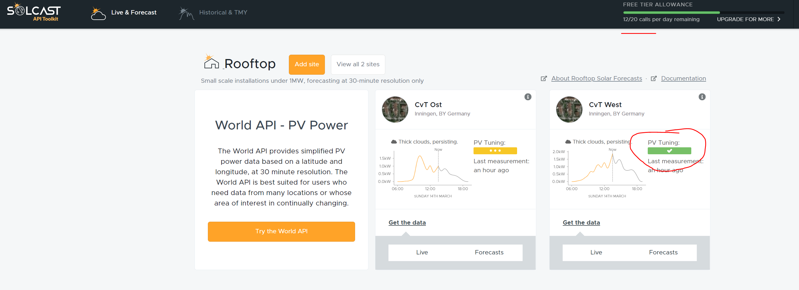 Dann hat SolCast das Tuning gestoppt, wie oben diskutiert. Das Tuning war vor allem für Split Arrays nützlich ... Als Alternative boten sie an, zwei Sites konfigurieren zu können. Das machte dann die 20 API calls/Tag noch knapper, da jeder Call zaehlte.