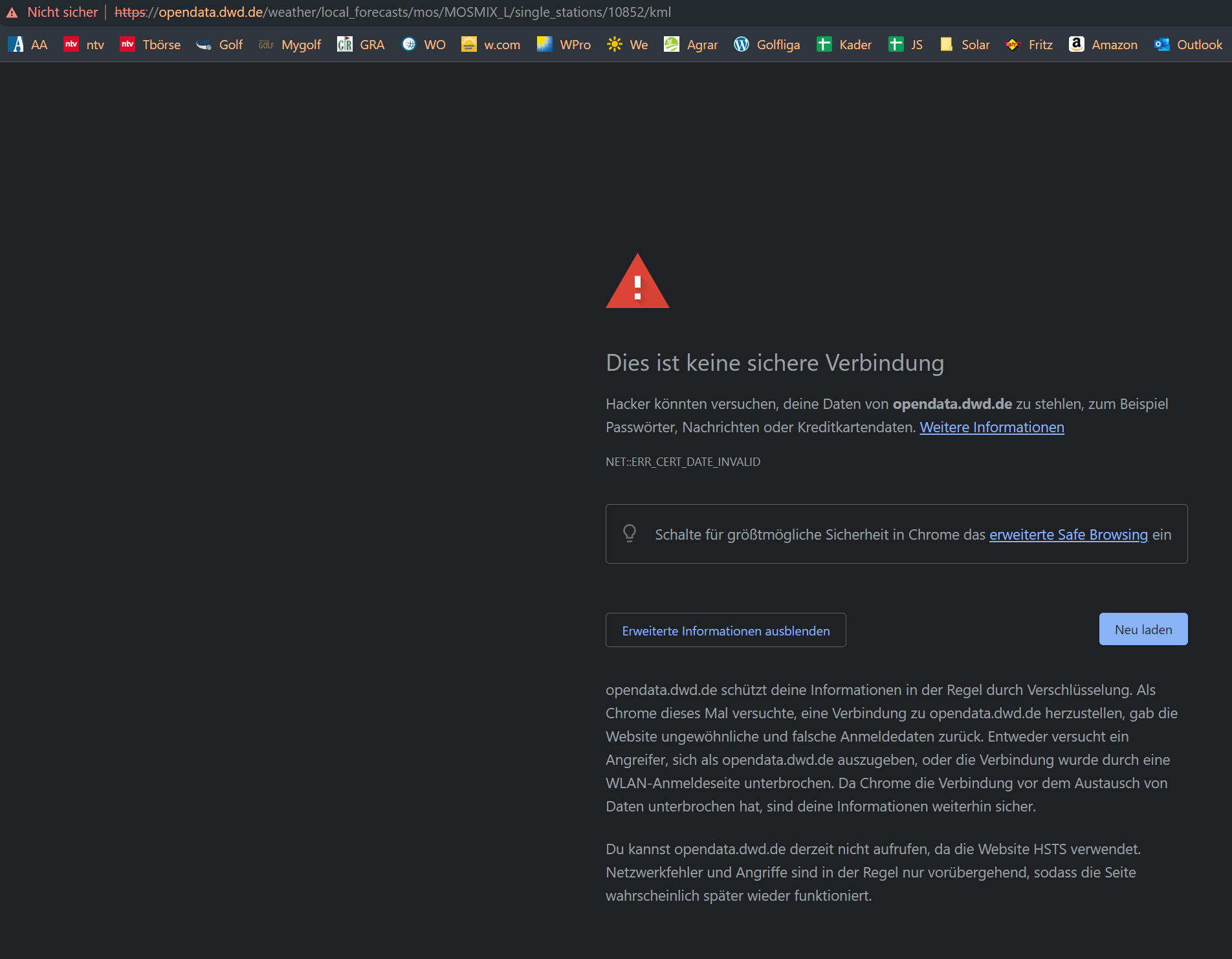 • MOSMIX (Deutscher Wetterdienst) hat zwar stündlich neue Daten - die Prognose von GHI (Strahlungsintensität) wird aber praktisch nicht nachgesteuert - was etwas enttäuschend ist, wenn man schon stündlich neue GBytes rechnet ...