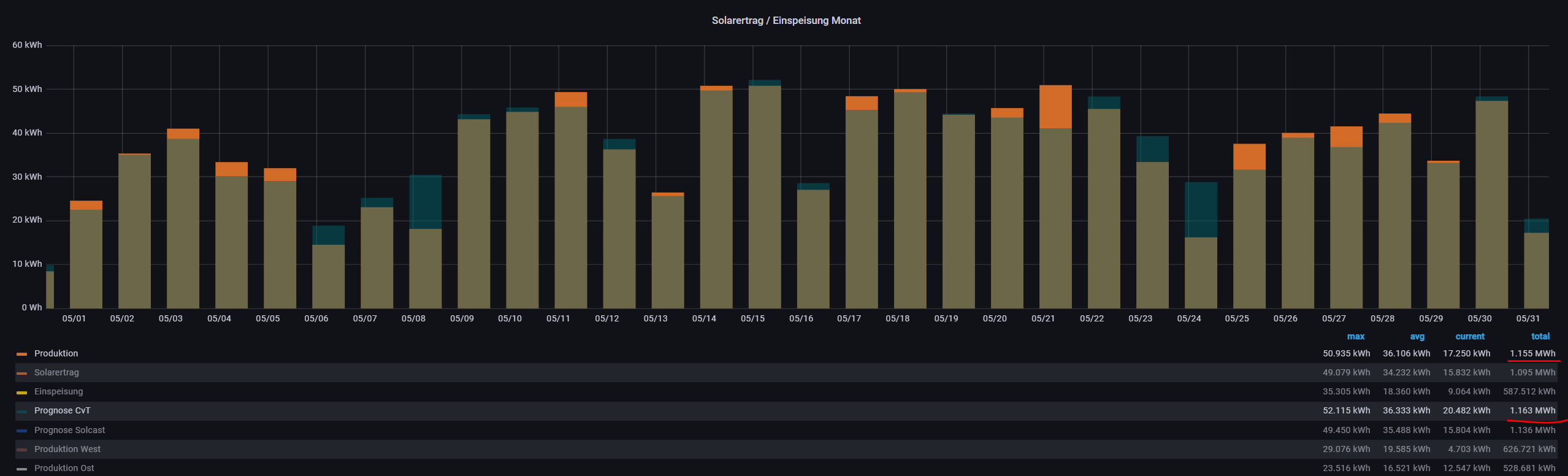 Die zweite Grafik ist die SolCast-Prognose. Diese zeigt vor allem für die Zukunft oft ziemlich unpassende Werte, justiert sich allerdings (meist im Nachhinein) noch nach und trifft dann den Wert recht gut. Vor allem hilft hier wohl, dass ich die ermittelten Realwerte auch wieder alle 30 Minuten an SolCast übermittle und dadurch die Prognose (eben meist im Nachhinein wieder angepasst wird). Die Abweichung über den Monat ist um 2%, da die Werte für die Zukunft (und diese brauche ich ja für meine prognosebasierten Steuerungen) aber oft stärker von meinen eigenen abweichen nutze ich die Prognose nur als Info und steuere mit meinen eigenen Prognosewerten: