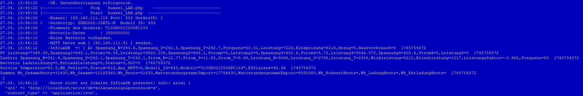 Ich habe den Update der Solaranzeige gemacht, leider ohne Erfolg, Fehler dass die Daten nicht an die Lokale InfluxDb gesendet werden besteht immer noch.