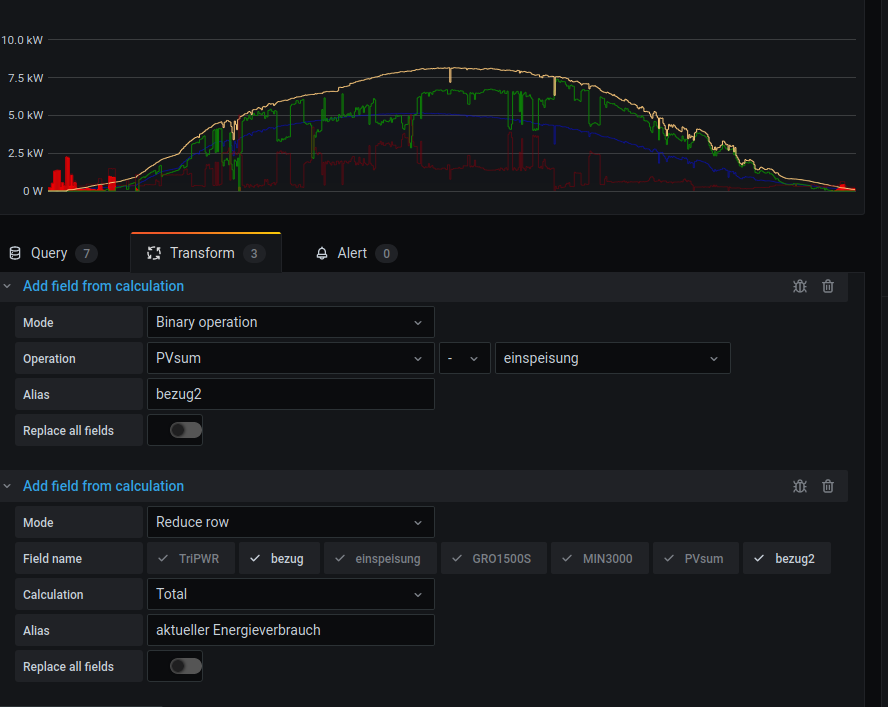 In Deinem Screenshot schaut es so aus als ob Du bei den Querys C (solaranzeige2) und A (solaranzeige1) Abfragen auf zwei verschiedene Datenbanken (solaranzeige 1 bzw 2) machst, stimmt das? Ich kann unterhalb des Graphen nur eine Datenbank auswählen (hier z.B. Solaranzeige002_3000) und dann dort auf verschiedene Measurements Bezug nehmen aber nicht auf verschiedene Datenbanken. Kannst Du meine Verwirrung aufklären? Danke, Dieter
