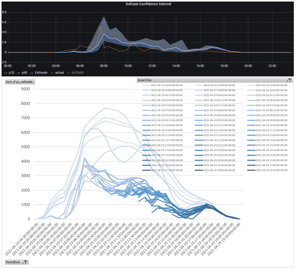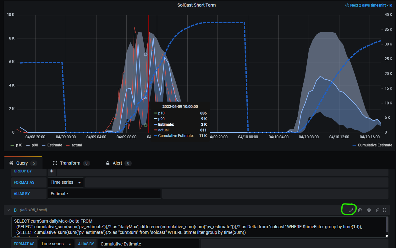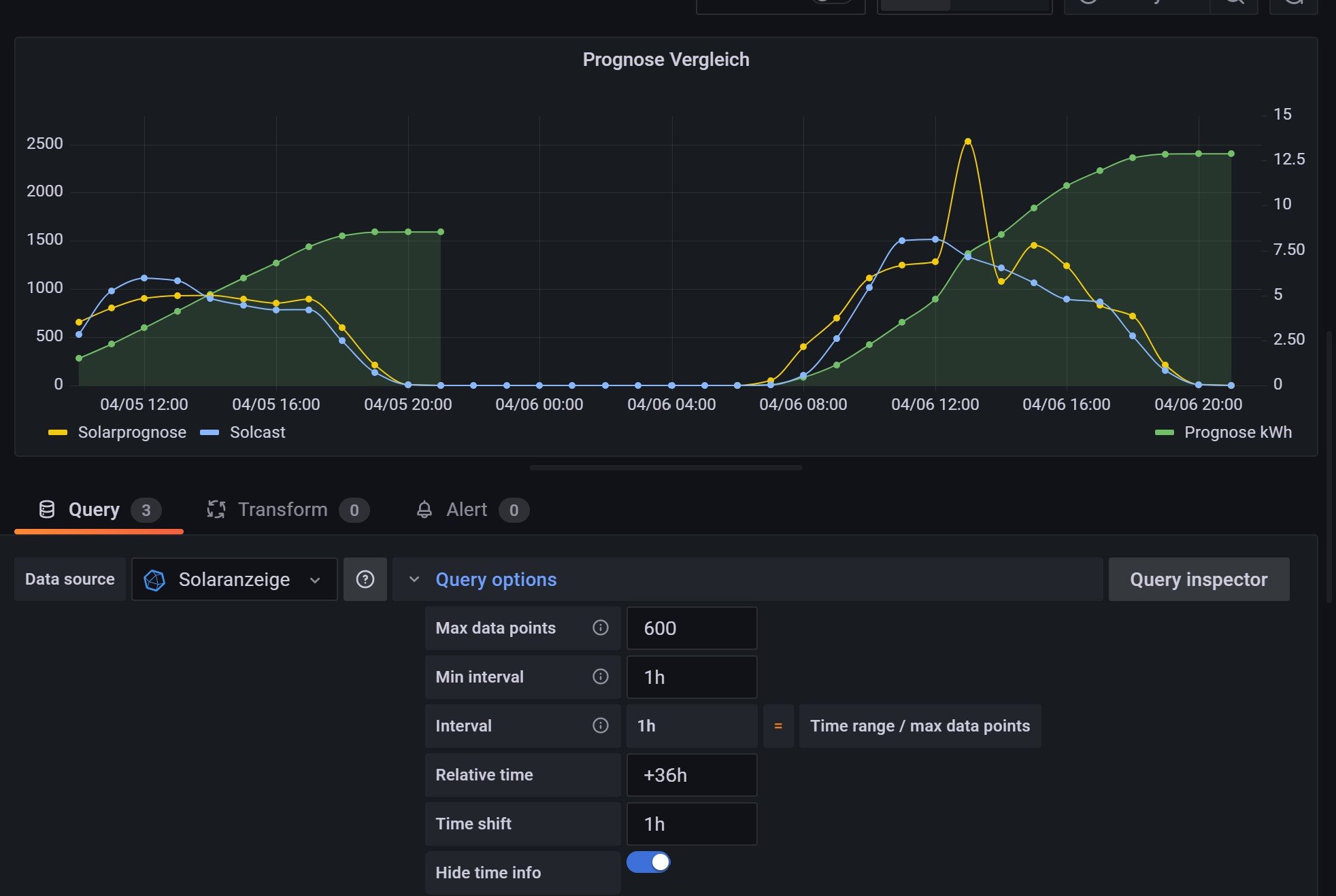 - Ich verwende hier sum(...)/2 statt integral(..., 1h) da die Solcast Vorhersagen der Mittelwert mit über 30min vor dem periodEnd Timestamp sind, aber das ist letztlich ein Detail