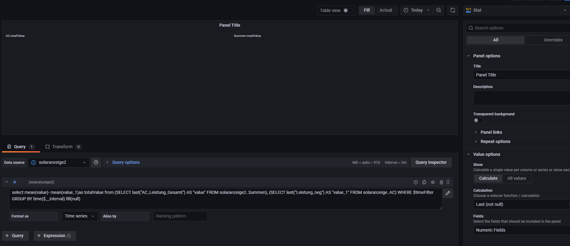 select mean(value)- mean(value_1)as totalValue from (SELECT last("Leistung") AS "value" FROM growatt..PV), (SELECT last("Leistung") AS "value_1" FROM solaranzeige..PV) WHERE $timeFilter GROUP BY time($__interval) fill(null)
