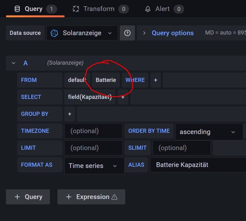 Bitte bei der Image Version 4.x einfach einen update auf die Solaranzeige machen und das aktuelle Dashboard importieren, dann ist alles wie bei dem 5.x Image.bobline hat geschrieben: ↑Fr 1. Jul 2022, 08:18Mit der aktuellen Version von Solaranzeige (5x) bekomme ich unter "Data Source" Solaranzeige einen "From" Batterie angezeigt.