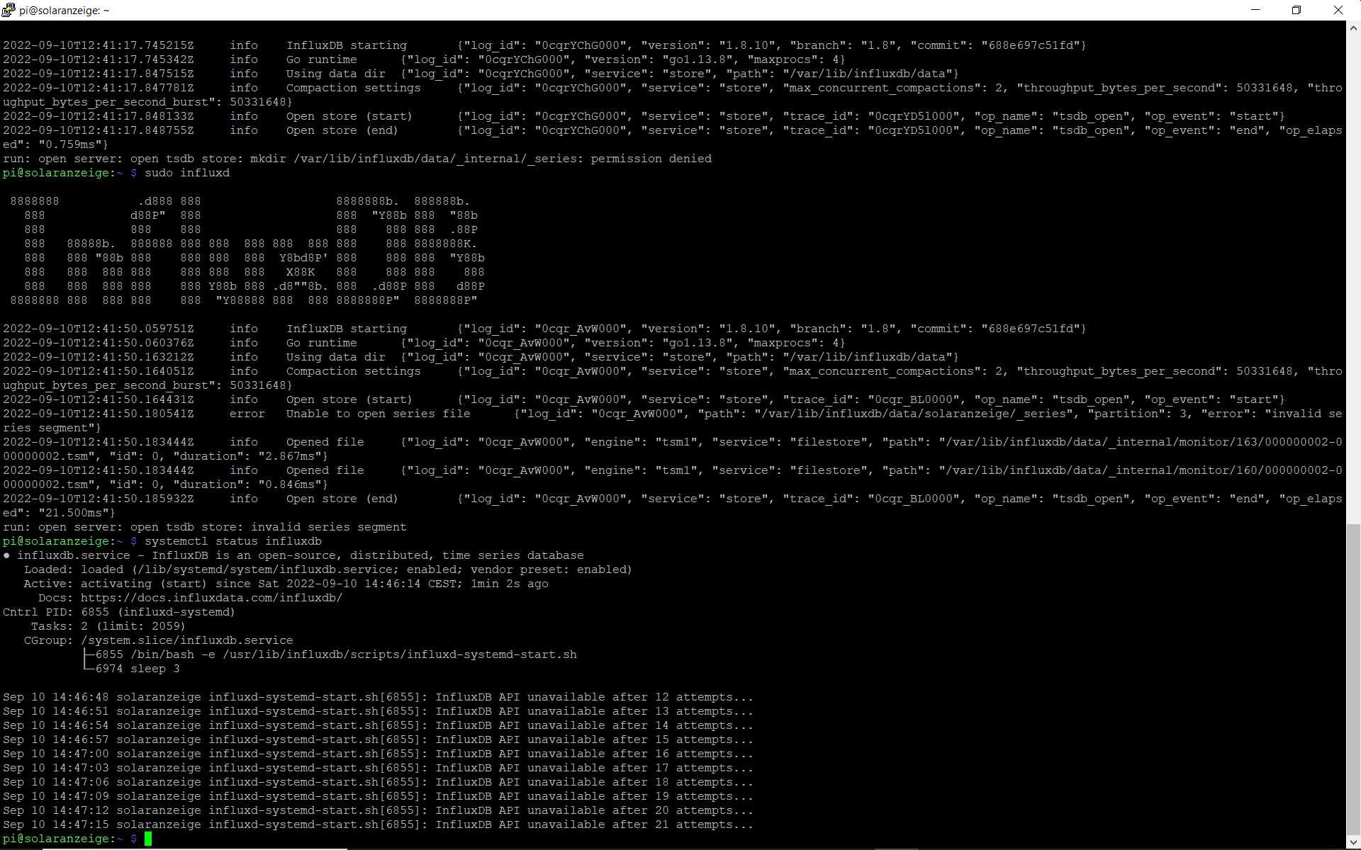 Da wirst du InfluxDB neu installieren müssen oder schneller und einfacher ein neues Image auf die SD-Karte installieren. Und dann nicht vergessen die SD-Karte ganz der Solaranzeige zur Verfügung zu stellen.
