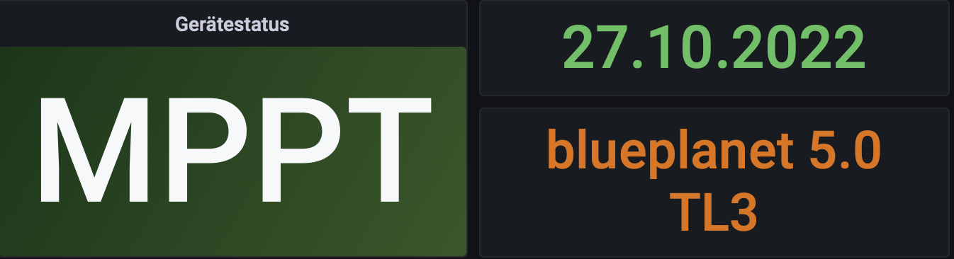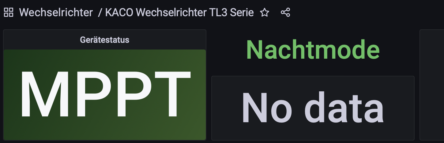 Ich habe eine 5,4 kW/p PV Anklage mit einem Kaco Blueplanet 5.0 TL3 mit MODBUS... soweit werden auch Daten usw angezeigt, allerdings in der ersten Zeile steht Nachtmode und No Date statt Datum und Firmware. Die Query scheint zu stimmen: