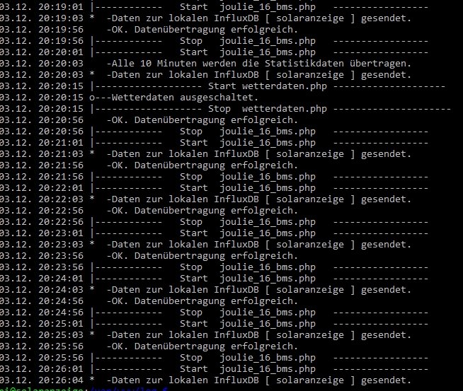 Das sieht dann so aus: Hier fällt die Fehlermeldung auf, dass das Balancen vor dem Ausführen des Befehls "OUTB" nicht gestoppt wurde. Das kann also nicht funktionieren und dementsprechend gibt es auch eine Fehlermeldung im Log und es wird auch nichts in die Datenbank geschrieben: Daraufhin habe ich in der Datei joulie_16_bms.php einfach mal ein bisschen die Befehle vertauscht, und siehe da, plötzlich werden Daten empfangen und in die InfluxDB geschrieben.