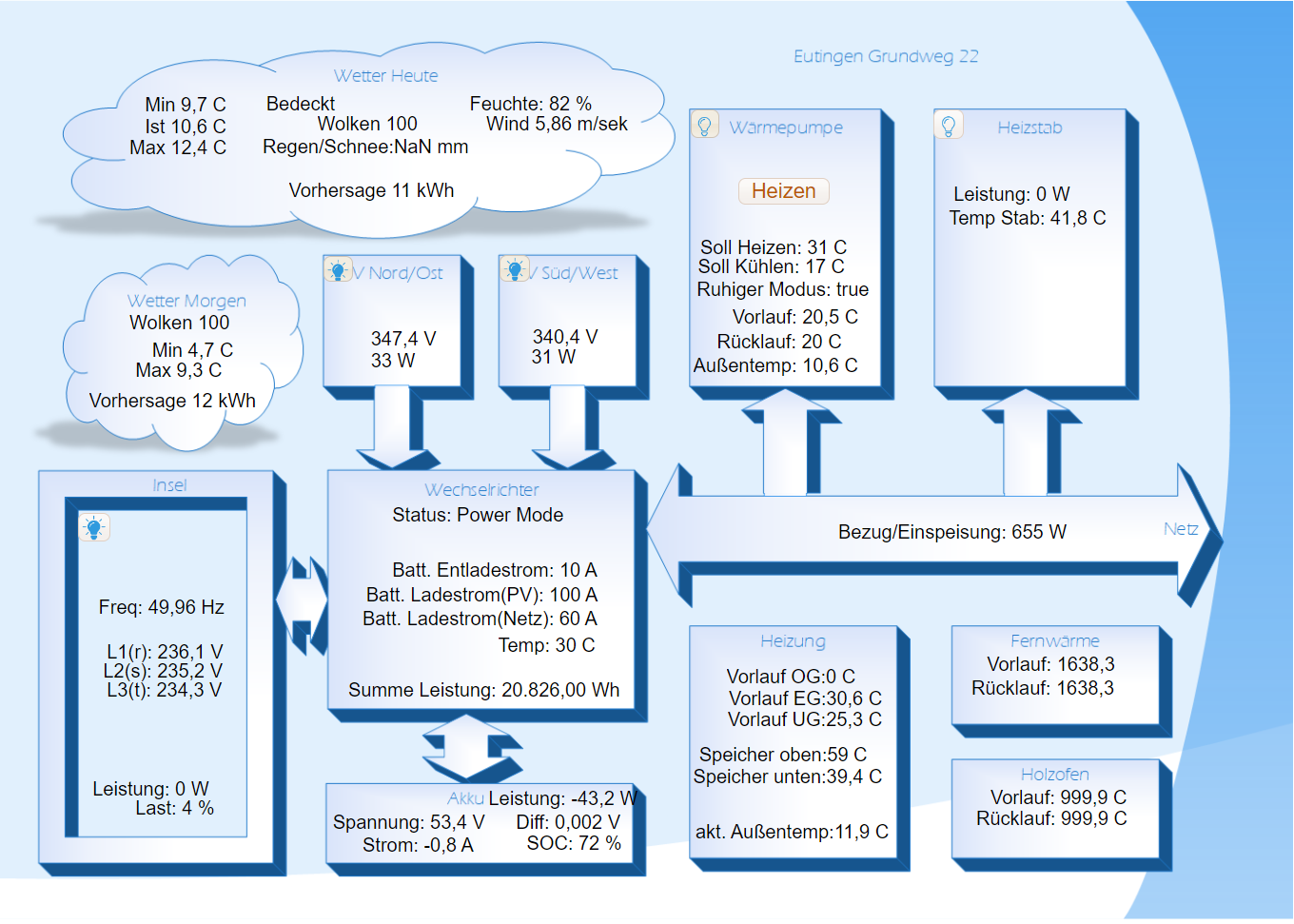 Hier ein Bild der wichtigsten Daten meiner Konfiguration (...die Sensoren für Fernwärme und Holzofen sind noch nicht angeschlossen)