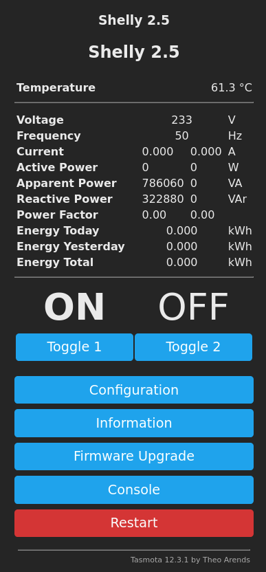 ABER: in Tasmota zeigt er keine Leistung, keinen Strom an..und die VAr Werte sind auch Hausnummern, egal welches Template ich unter github raus fische und was man manuell anklicken kann, Ich hab jetzt bald 5Tage und Nächte rum, die Dinger mögen am Mars funzen..ich jedenfalls pack den Shelly 2plus nichmal mehr aus..