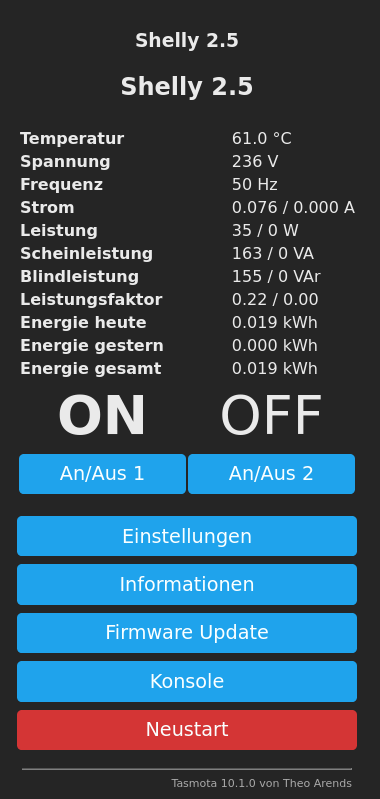 Den 2.5er ausgepackt, via original APP versucht anzubinden, auch hier wieder krasse Abweichung zur Beschreibung, erst nach 6maligem Powercycle will dat dingen den WiFi Accesspoint rausrücken...egal, bins ja gewohnt. Da den Shelly kurz angetestet ob alles geht, ja geht, zeigt Leistung etc an.passt.