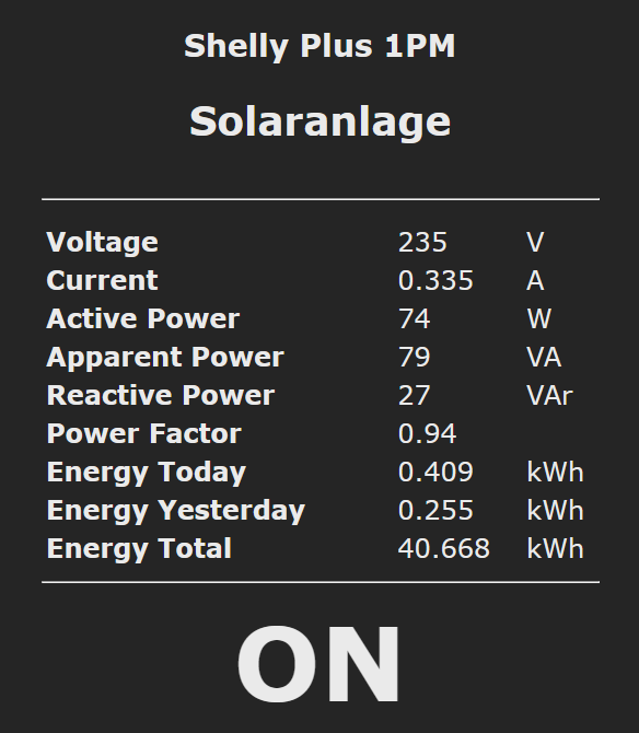 Ich habe 3 Stück Shelly 1pm plus in der Solaranzeige in Verwendung (+2 Solaredge Wechselrichter).