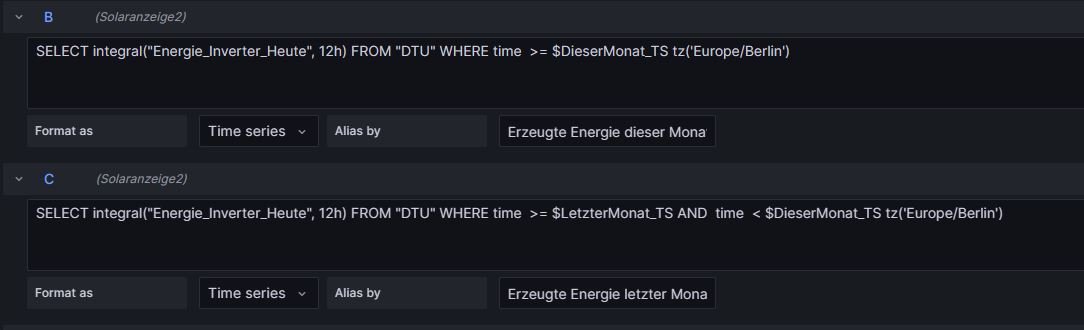 SELECT max("Energie_Inverter_Heute") FROM "DTU" WHERE time >= $DieserMonat_TS GROUP BY time(1d), "Energie_Inverter_Heute"::field tz('Europe/Berlin')Code: Alles auswählen