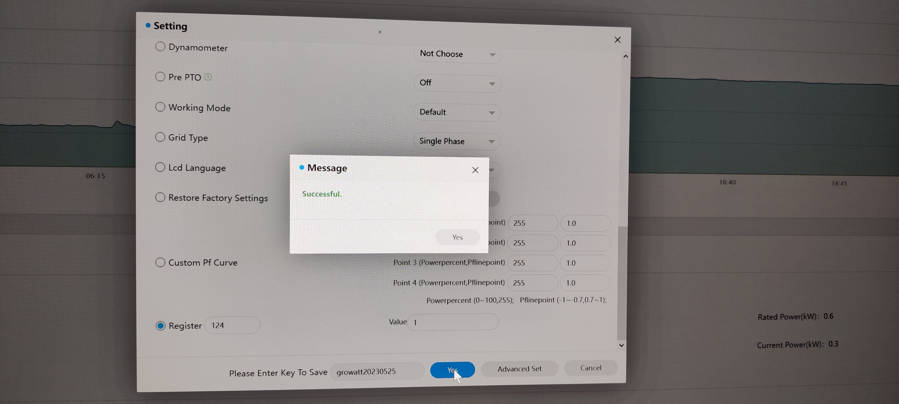 Die Registereintragung für DC-Mode musst du auf server.growatt.com einstellen. Bei "My Photovoltaik Devices" ganz rechts auf "Settings" drücken.