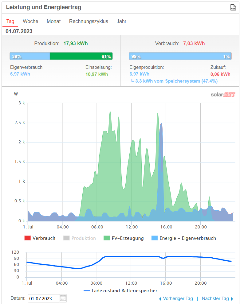 Am 1.7. hingegen sieht man die grüne Linie der PV Erzeugung früh morgens nicht, da erst einmal der Akku aufgeladen werden musste.