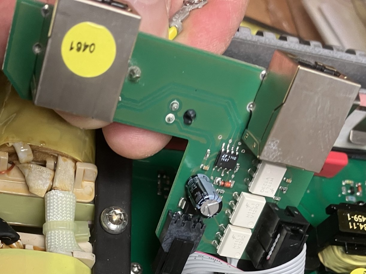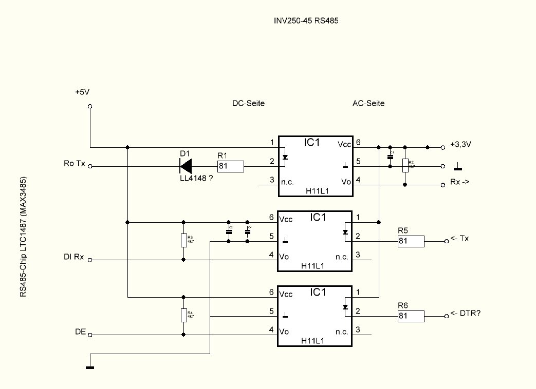 Hier sind ein paar Bilder des RS485-Boards aus einem INV250-45 RS485, den ich eh wegen Reparatur offen hatte. Die Schaltplanskizze ist nur auf die Schnelle zusammengekritzelt und nicht vollständig, aber man sieht, wie die Potentialtrennung gelöst ist.