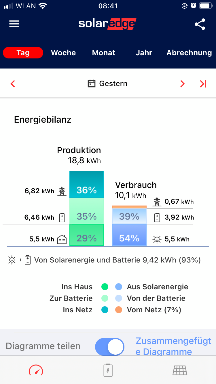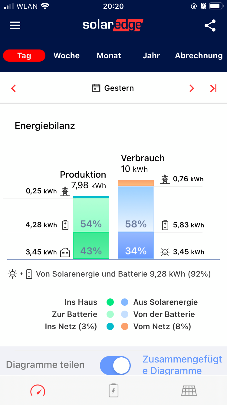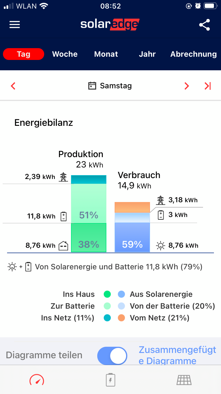 Ich habe keine Batterie der Wert der SE App ist die produzierte Summe des WR aufgeteilt in Eingespeist und selbst verbraucht. Und das sollten 64kwh sein. Daher habe ich mich gewundert das die Solananzeoge nur 51kwh anzeigte. Die Frage ist warum?