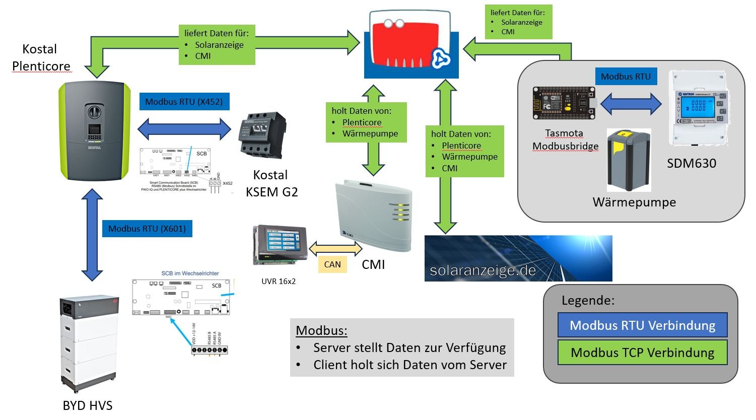 Immer mehr Wechselrichter und Laderegler benutzen das MODBUS Protokoll auf der Kommunikationsschnittstelle. Dabei ist zu beachten, dass in der Regel nur ein Gerät diese MODBUS Schnittstelle zum Auslesen der Daten benutzen darf! Bei MODBUS RTU immer, bei MODBUS TCP hängt es von dem Treiber im Gerät ab. D.h. wenn die Solaranzeige den Wechselrichter ausließt, darf kein weiteres Gerät wie z.B. ein Smart Meter den Wechselrichter auslesen. In allen Fällen muss der Wechselrichter dafür vorgesehen sein, dass mehrere Geräte ihn auslesen oder steuern. Manche Wechselrichter haben spezielle Anschlüsse für Smart Meter oder Batterie-Management-Systeme usw. Dann funktioniert es. Hat das Gerät aber nur einen MODBUS RTU Anschluss oder eine MODBUS TCP Schnittstelle, dann kann man erst einmal davon ausgehen, dass die nur ein Gerät bedienen kann!