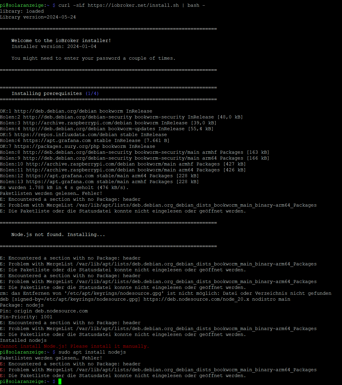 Da ich nun viele Adapter nicht mehr updaten konnte weil Nodejs und NPM zu alt waren, habe ich auf anraten ein neues System mit dem 64 bit Bookworm Debian Image aufgesetzt.