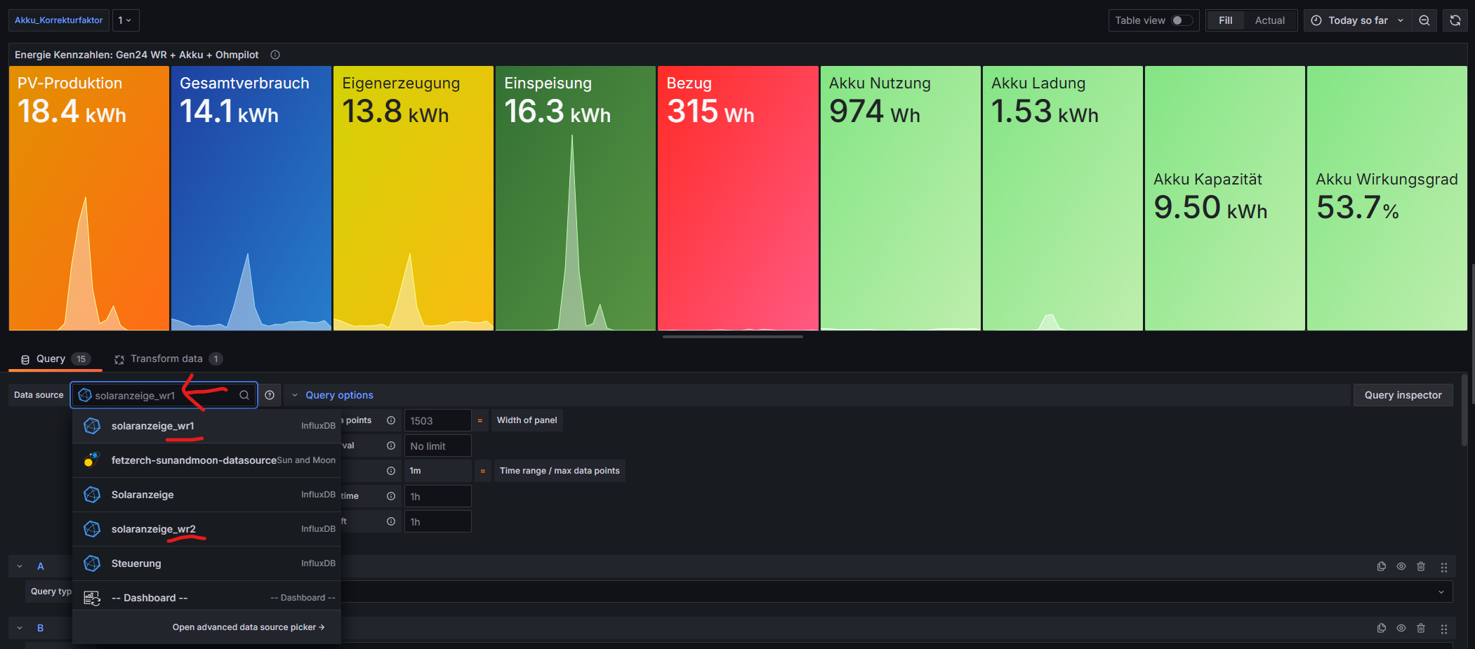 Problematik in Grafana, wenn ein WR temporär keine Daten liefert (warum auch immer) dann funktioniert die Berechnung in Grafana leider nicht.. zumindest wie ich es in Erinnerung habe.