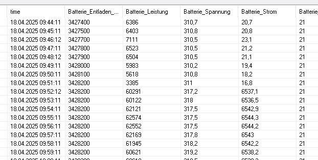 Das Entladen wird normal angezeigt, aber beim Laden springt der Wert von quasi Null auf 60 kW, was ja völliger Unsinn ist. Nun dachte ich erst, da hat sich evtl. ein Komma verschoben, aber beim Entladen passt es ja. Die Daten in der InfluxDB sehen natürlich entsprechend so aus: