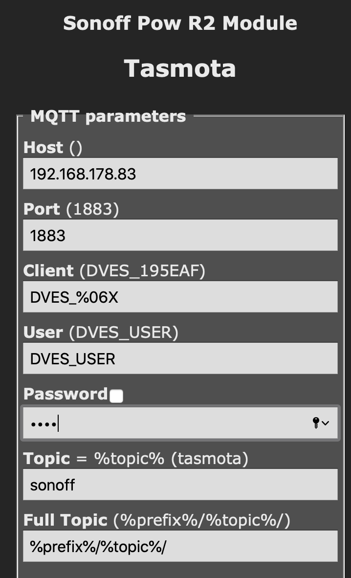 Das heißt wohl, dass auf dem Solaranzeige-Raspberry ein MQTT-Broker laufen muss. Den Sonoff musste ich dazu etwas konfigurieren (s. Bild).
