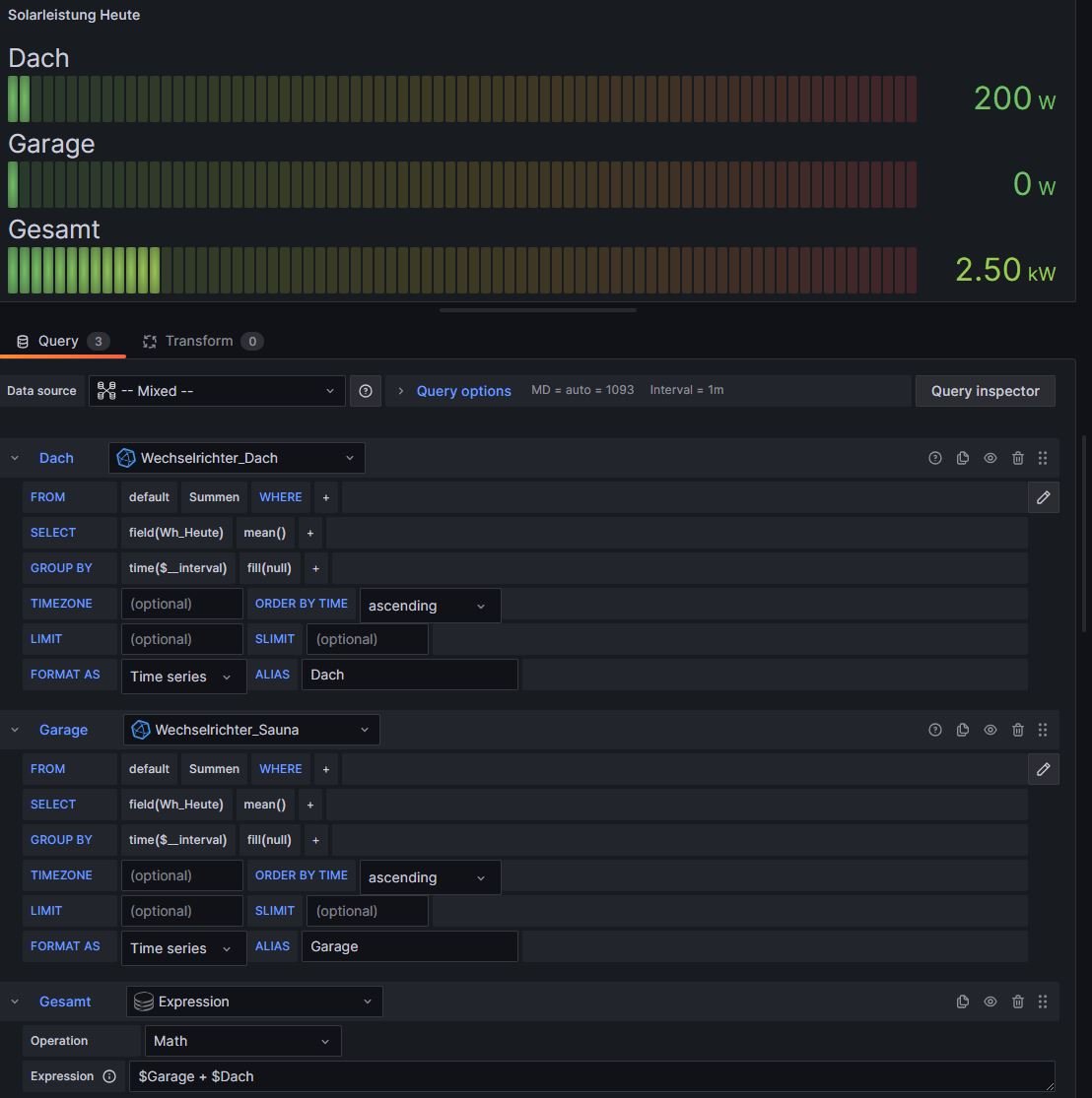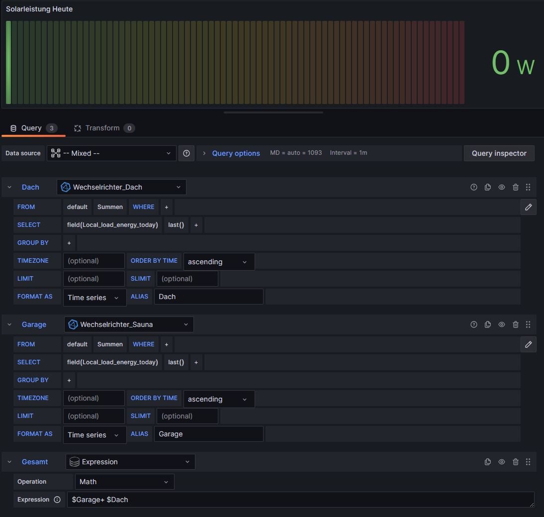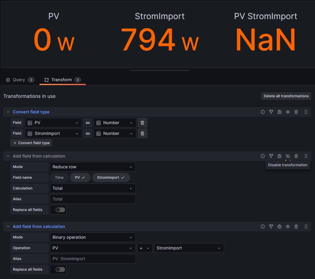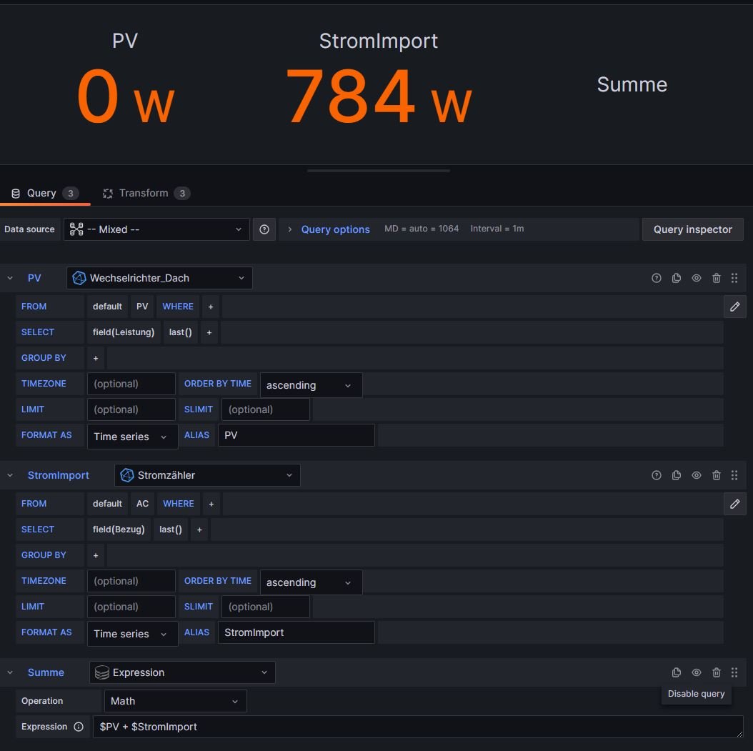 @Timo: "kombinierte Abfrage"? Was genau meinst du? In der Query funktioniert nur solange, wie auch Daten in die influx gespeichert werden. Wenn ein Gerät sich abgeschaltet hat (oder man es entfernt hat), dann wird die influx nicht mehr gefüllt und man bekommt NaN zurück. Weder Expressions, noch Queries funktionieren dann noch. Man kann zwar über Value Mapping NaN eine 0 zuweisen, aber das nutzt nix, da das nur Text ist. Eine Umwandlung in Numerik funktioniert auch nicht ...