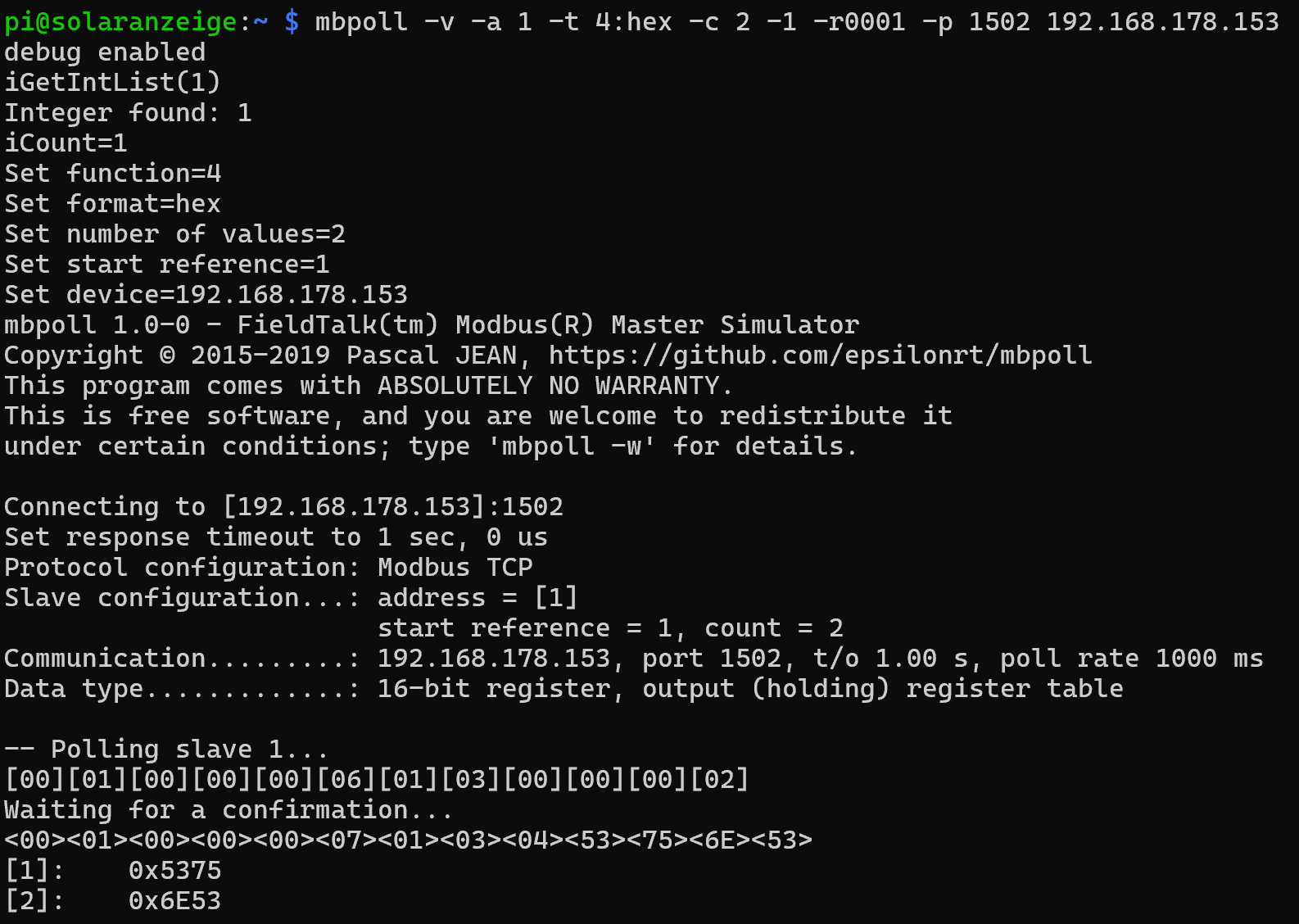 Dein Test mit mbpoll ist positiv verlaufen nach dem Neustart des Wechselrichters. Jetzt musst du nur noch in der user.config.php
