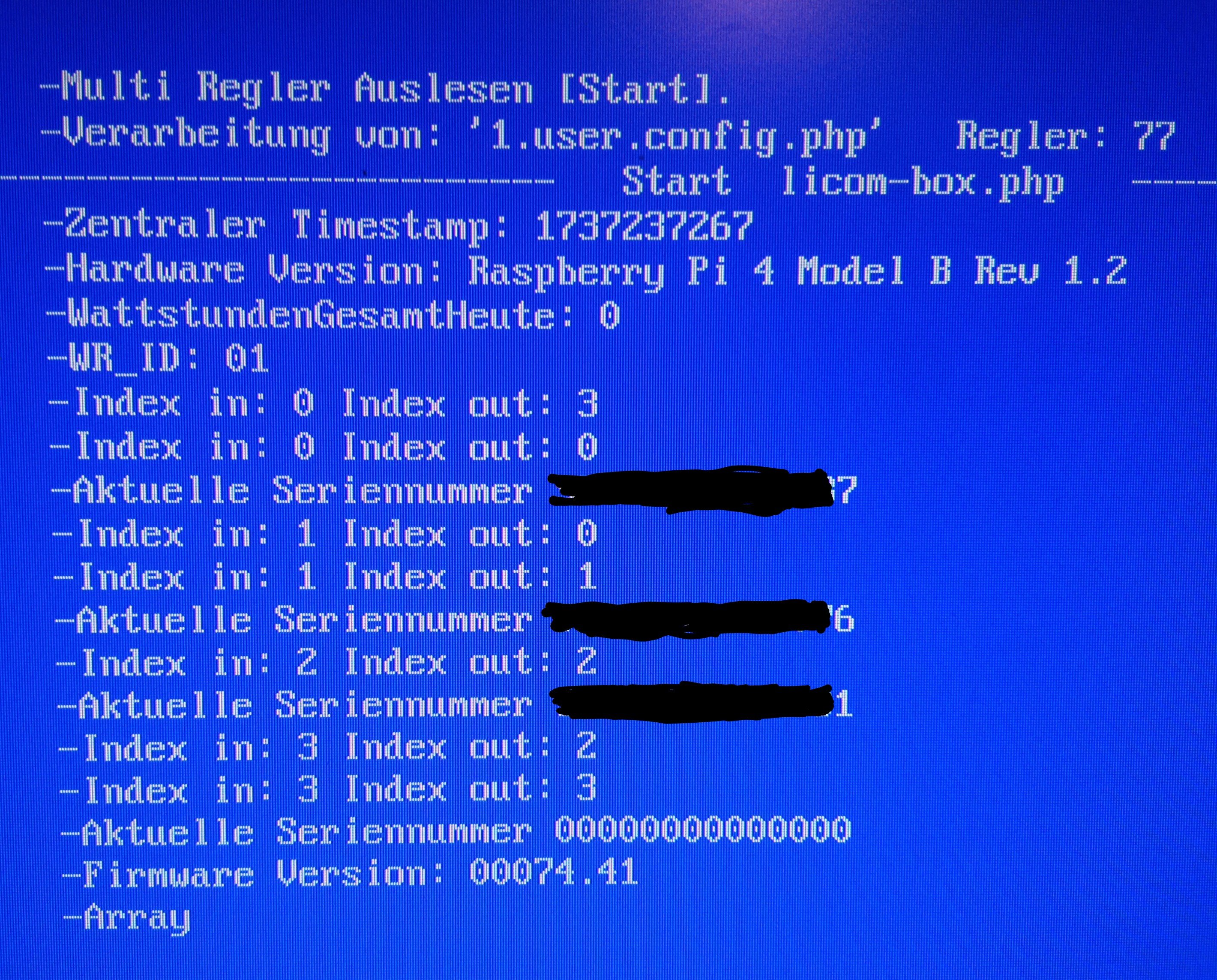Ich bin nun ein Stück weiter. Die Licombox wird mit der Seriennummer 00000000000000(14×0) erkannt, und in der solaranzeige.log sind dann auch alle Seriennummern meiner 3 Wechselrichter zu sehen.