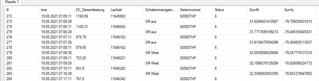 Es ist Vormittag (AZ < 0, also Sonne im Osten), die Sonne steigt über 32 Grad (ab da fällt erste Sonne auf Westdach und der Kamin wirft einen Schlagschatten bei mir auf Westdach), SM West wird eingeschaltet, also richtig (für mich). Bei mir passiert dies aber erst gegen 10 Uhr, bei Dir schon um 9 Uhr (Influx hat UTC Zeit, wir haben UTC +2)