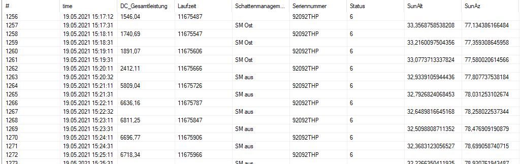 OK, dann als erste Information SM3 heißt beide Strings mit Schattenmanagement (also Ost + West), so einen Fall habe ich nicht, daher kommt auch nie SM3. Ausschalten aller Schattenmanagement ist SM0 (Text SM aus) und dies wird ja korrekt ausgeführt.