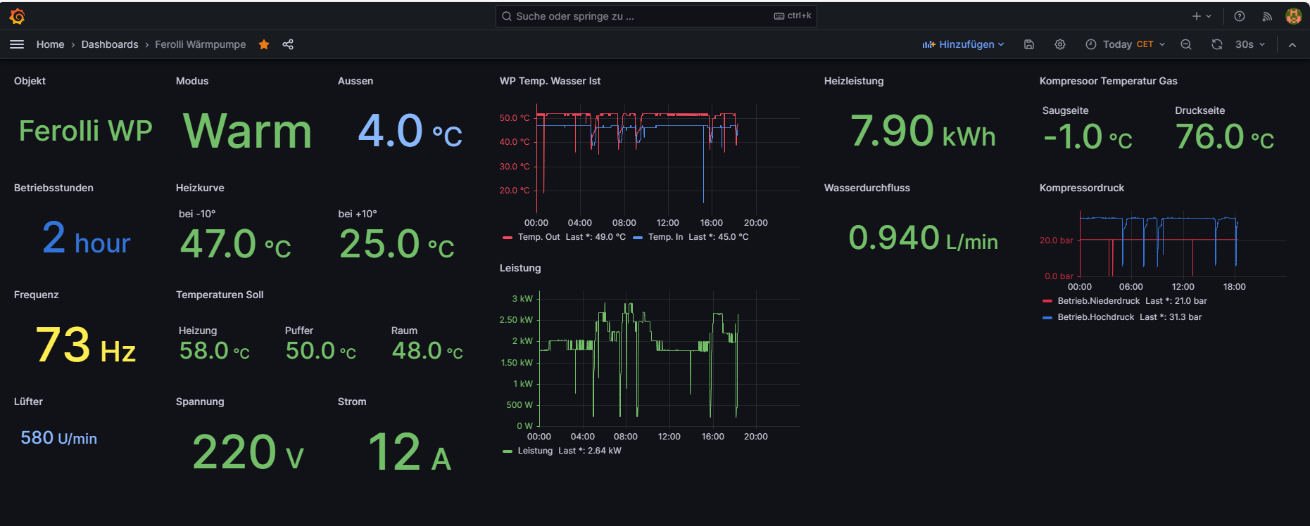 somit sind das doch recht viele hier nochmals vielen Dank an Ullrich den ohne ihn wäre das so nicht möglich , auch wurde ein Shelly 2pm pro mit aufgenommen und aktuell schraubt er an einem Edelmann Wärmemengenzähler rum der mit einer modbus Platine ausgestettet ist da diese Wärmemengenzähler auch Eichbar sind und somit sehr genau Werte liefern kann man hier dann auch seinen COP der Wärme Pumpe errechnen. hier schonmal mein Dashboard dazu wenn da jemand was besseres Bauen möchte immer her damit wie Ihr seht kann man doch recht viele Werte auslesen die durchaus relevant sind die Leistungswrte stimmen sehr genau was eigentlich einen Shelly nicht zwingent erforderlich macht.