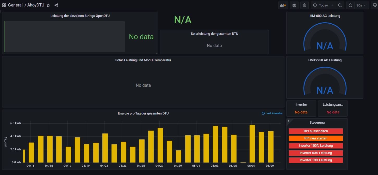 Unten die zwei Bildervom Dashboard sind von vorher/nachher, ich hatte noch etwas an meinem Dashboard gearbeitet aber auch bei Feldern die ich nicht angepasst hatte wie Datum oder Solarleistung steht jetzt No Data.