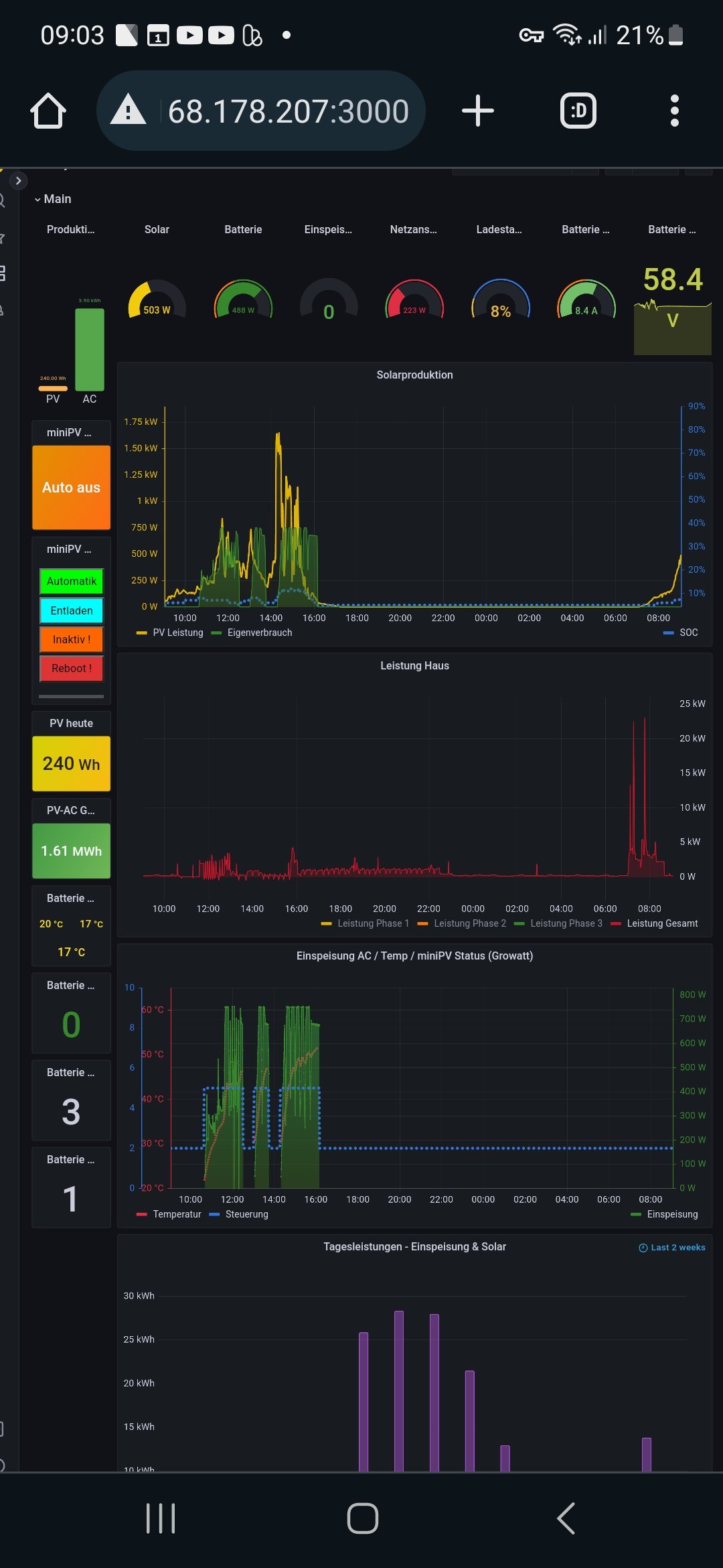 Läuft in den Piloten soweit gut, wie öfters bereits geschrieben, muss es demnächst mal in den Standard Code überführt werden, Problem ist, dass es natürlich immer wieder Solaranzeige Updates gibt und das mal in einen Zeitpunkt mit allen Anpassungen als Steuerung hinzugefügt werden muss.