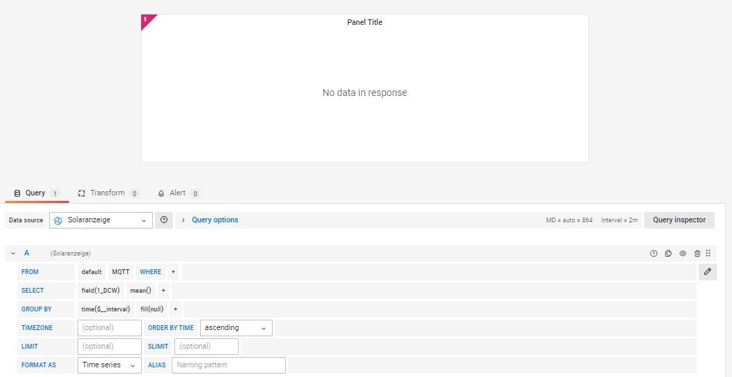 Bin auch schon kurz vor dem Ziel, d.h. ich sehe wie die Daten per MQTT auf der Solaranzeige empfangen werden und sehe auch Werte in der Influx-db Solaranzeige: