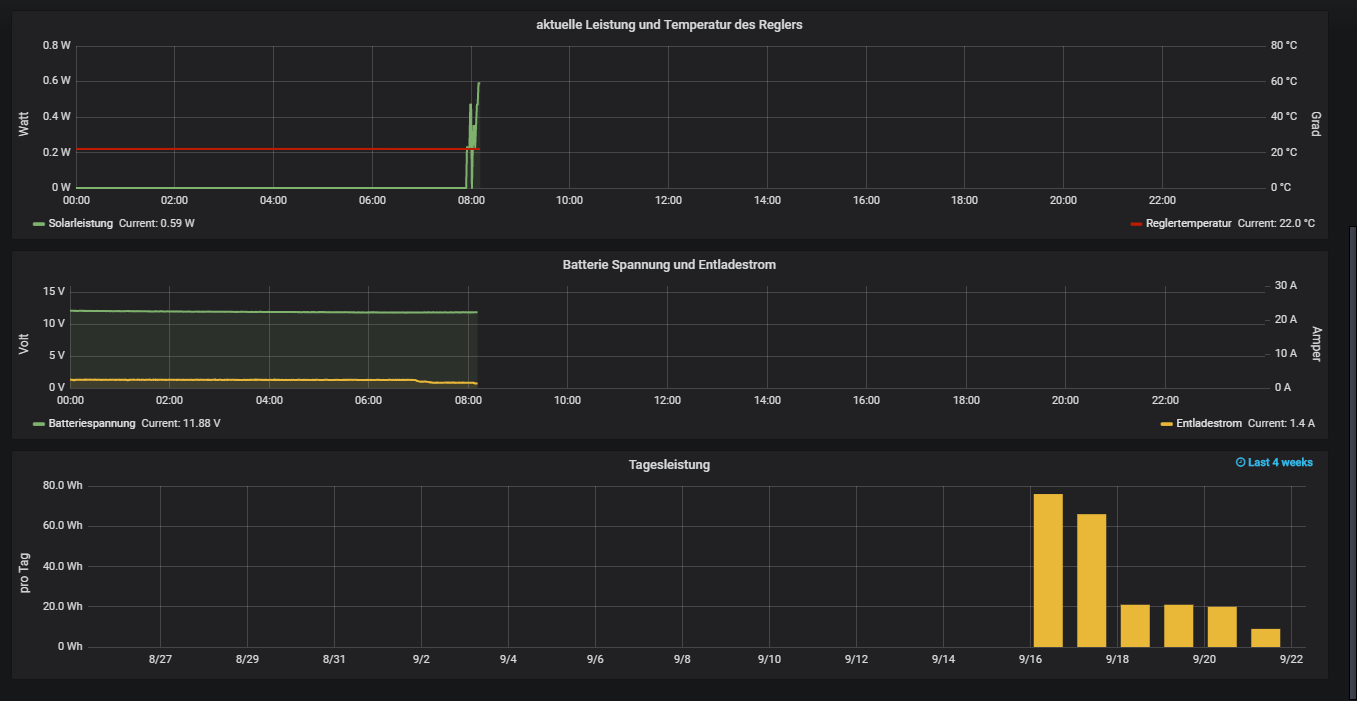 verwendet wird ein Regler Epever Tracert 30A mit eLOG01 box die zusätzlich die Daten in einer Datei speichert.