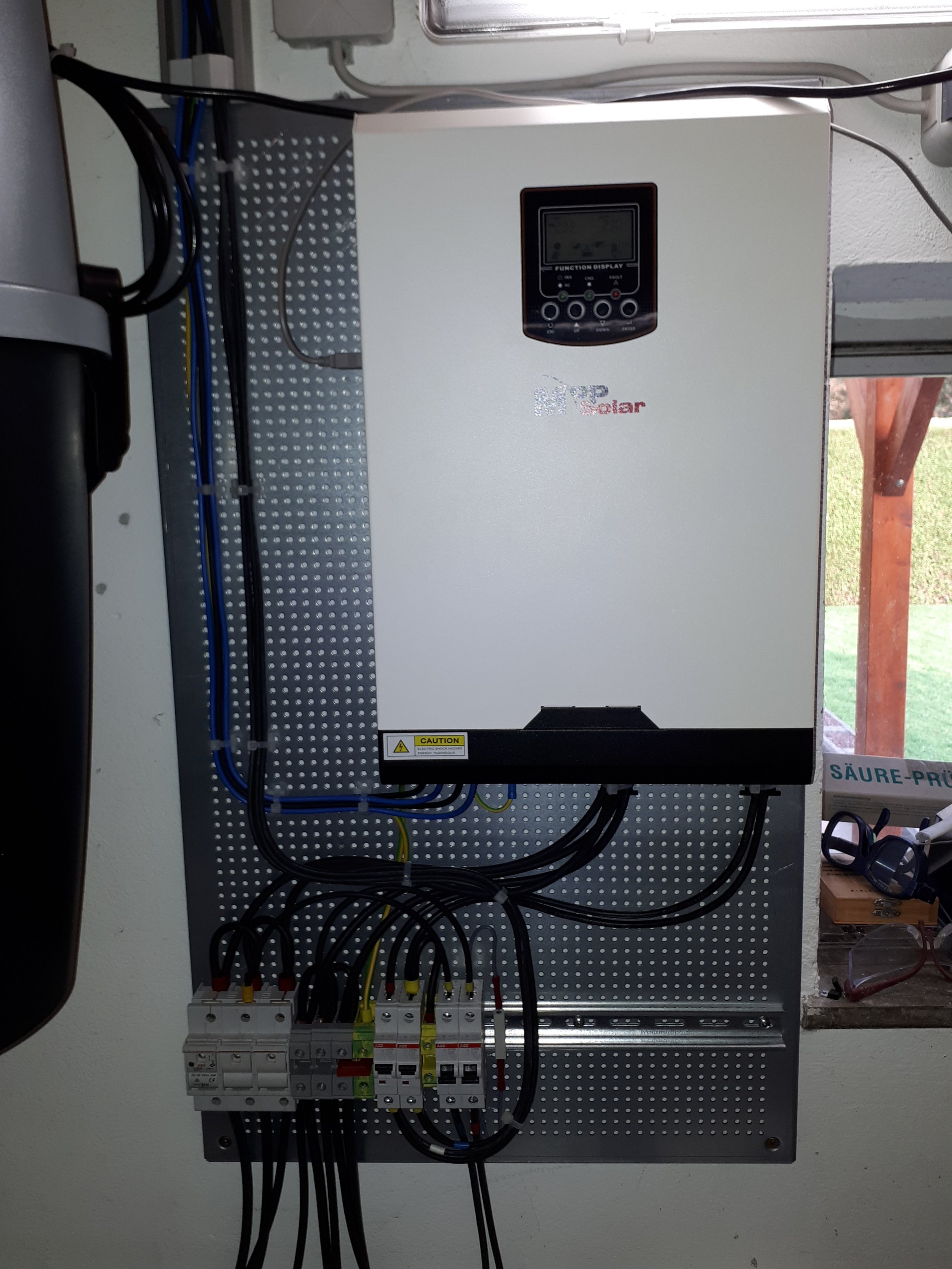 die Anlage läuft jetzt knapp 3 Wochen, soweit ist alles zufriedenstellend. Ich hatte die Anlage die ersten 2 Tage provisorisch auf der Werkbank verkabelt, dabei ist mir folgendes aufgefallen. Die Batteriespannung schwankt je nach Belastung recht stark, was für eine Bleibatterie normal ist. Ich hatte Leitungsschutzschalter und 10mm² Kabel zwischen den Batterien und dem Wechselrichter angeschlossen. Bei kleiner Leistung war alles OK. Bei hoher Leistung war der Spannungsfall über die Leitungsschutzschalter und den 10mm² Kabeln sehr hoch, wodurch der Wechselrichter recht schnell an die Spannungsschwelle zur Umschaltung kann. Nach Lastabschaltung stieg die Batteriespannung recht schnell wieder an. Darum habe ich die Batterien jetzt mit dicken Kabeln bis kurz vor dem Wechselrichter geführt und erst ab der Sicherung mit 35mm² (mehr geht in die Klemmentasche nicht rein) angeschlossen. Wenn meine Frau Ihre Bügelstation einschaltet wird es schnell kritisch, diese zieht beim Aufheizen 2650Watt aus dem Wechselrichter. Ich werde das Bügelzimmer dieses Wochenende aus der Insel raus nehmen. :)