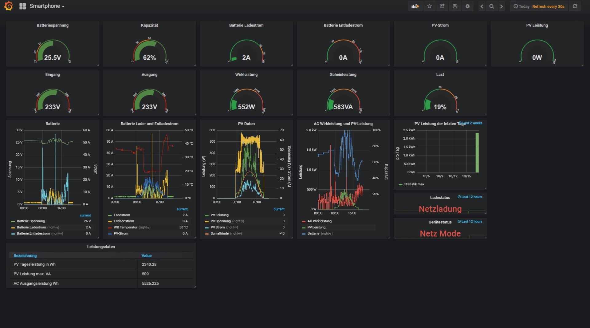 Zur Visualisierung nutze ich einen Raspberry Pi3 mit der Solaranzeige V4.1.0 und Grafana.