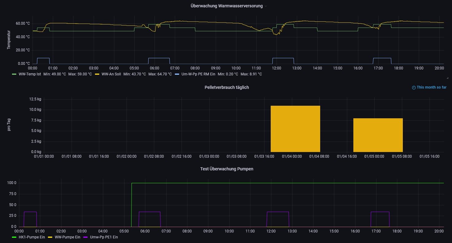 ich habe wie der Kollege oben beschrieben das Monitoring von Projekt Ökofen Spy (über Python) als Anstoß genommen. Habe mit einem PI3B+ und bash das realisiert. Ich steuere auch den Kessel mit dem Programm. Habe die influxdb und grafana dann so wie in dem oben genannten Projekt beschrieben durchgeführt. Der Initiator des Projekts hat das grundsätzlich sehr gut aufbereitet.