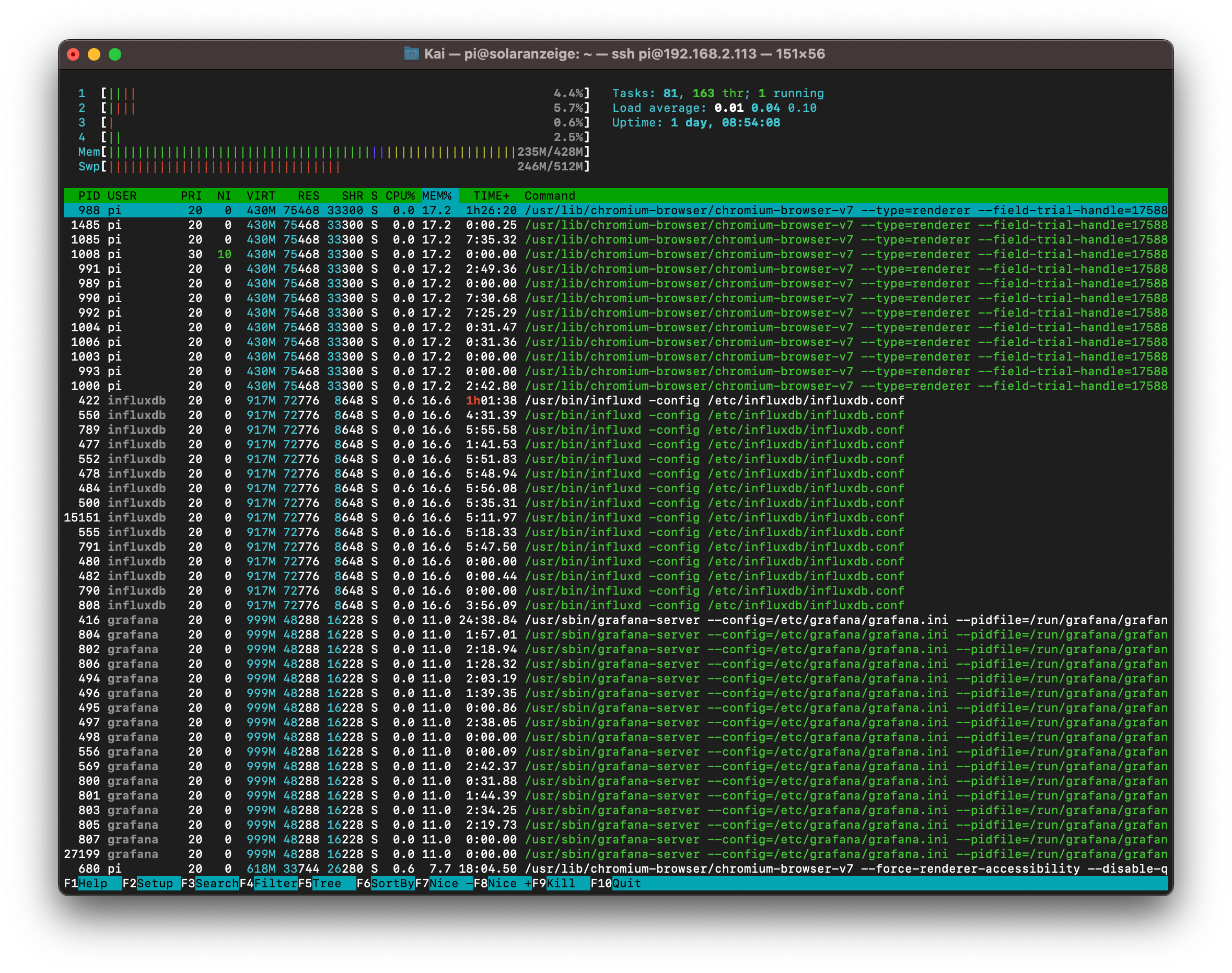 wenn es läuft, passt es doch. Ich habe das Ganze auf einem RaspberryPi Zero laufen. Allerdings ohne grafische Oberfläche. Grafana öffne ich immer extern (Handy oder am Computer). Zusätzlich läuft auf dem kleinen noch ein Nodered, was mit meine Steckdosen steuern kann.