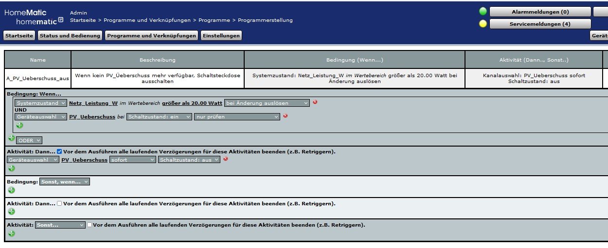 Ein Zentralen-Programm in der CCU sorgt dann dafür, dass eine Schaltsteckdose „PV_Ueberschuss“ eingeschaltet wird, wenn PV-Überschuss vorhanden ist: